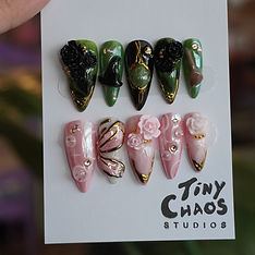 2 for $130 bundle with code: WICKEDBUNDLE (must add 2 to cart!) Looking to expand your nail art skills? Join @dimsumnails for a guided nail art class where you’ll learn to create this 3D, Wicked-inspired set! Channel your inner Elphaba and Glinda as we incorporate multiple different techniques including blooming gel, 3D sculpting, gems placement and chrome. You’ll be able to customize the shape and length of your set. Your nails will be custom-sized using Aprés tips to fit you perfectly. This is an intermediate level class. Participants should have taken at least 1 class at Tiny Chaos or be able to confidently paint solid color nails, understanding brush control to get a smooth and even coat. The rest will be taught in class! Class Includes: - Set of custom sized Aprés nail tips - Storage case to take your set home - Full application kit - All materials needed - Step-By-Step Instructions & Guidance